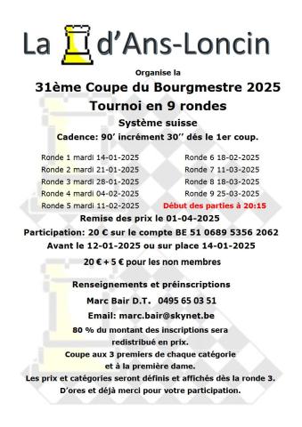 Le mardi 14 janvier, la T.A.L organise la 31 ème édition de la Coupe du Bourgmestre.Il s'agit d'un tournoi en 9 rondes sur un système suisse.Rendez-vous à la Salle "Les Tilleuls" , 40 Rue de Jemeppe à 4431 Loncin ! Date de début 14/01/2025 Date de fin 11/02/2025 Club Standard de Liège TAL 621 Lieu Salle des Tilleuls